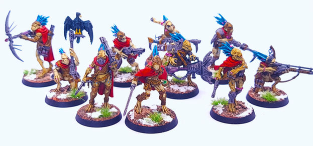 Driven by a deep respect for ancestry and the natural cycle of life and death, Kroot culture centers on the wisdom of their kindred and the strategic use of their unique biology. While often underestimated as primitive, Kroot warbands are highly mobile, cunning, and deadly in close combat, making them ideal scouts and ambushers. Though they fight under the T’au banner, the Kroot maintain their own values and priorities, and their loyalty ultimately lies with their kindred first and foremost.